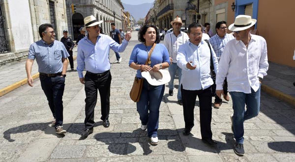 Oaxaca de Juárez, Oaxaca, a 11 de abril del 2019.- Para determinar acciones inmediatas y unir esfuerzos que mejoren la experiencia de quienes visitan Oaxaca de Juárez, Ciudad Patrimonio Mundial, servidores públicos municipales y empresarios del Centro Histórico realizaron un recorrido por el Andador Turístico y otras calles del primer cuadro de la Verde Antequera.