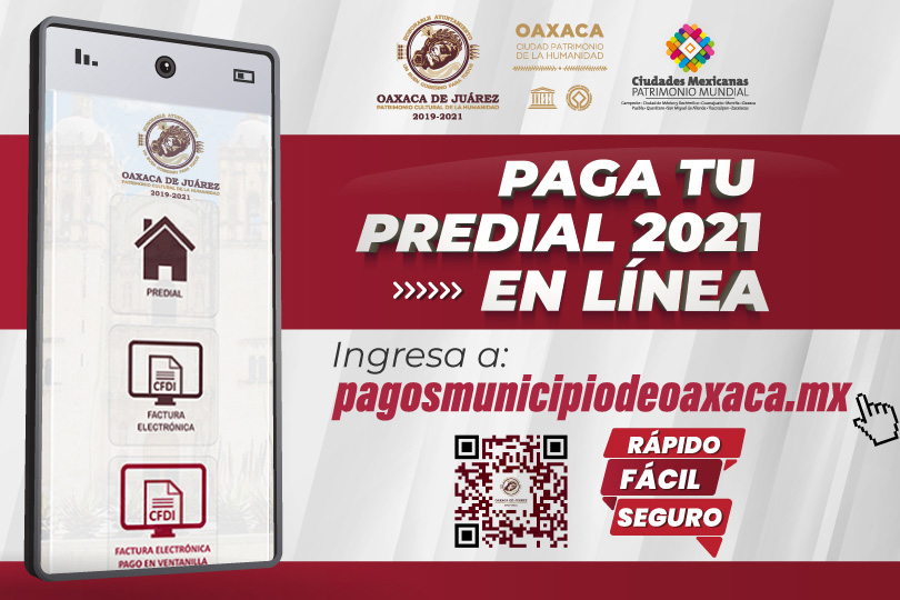 Oaxaca de Juárez, Oaxaca, a 27 de enero de 2021.- El Presidente Municipal de Oaxaca de Juárez, Oswaldo García Jarquín, dio a conocer a la ciudadanía que, a partir de este miércoles 27 de enero, el Ayuntamiento de la ciudad habilitó el sitio https://pagosmunicipiodeoaxaca.mx en el que se podrá realizar el pago del impuesto Predial 2021.
