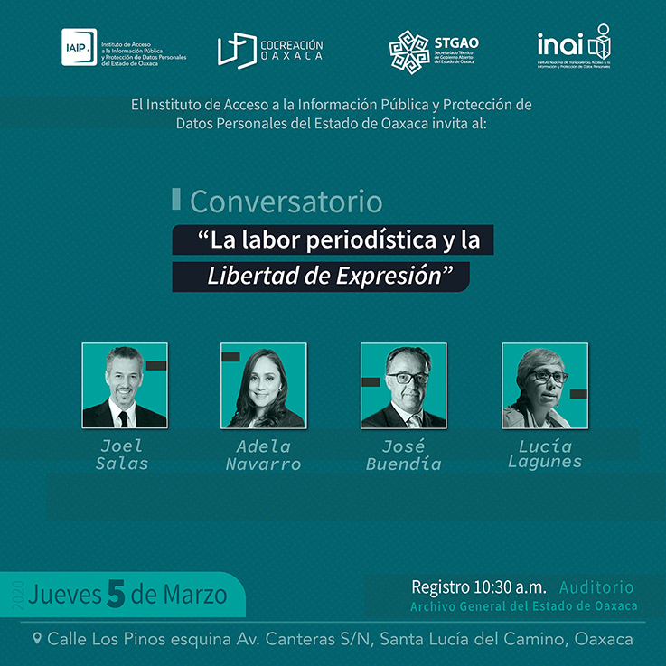 Oaxaca de Juárez, Oax. Con el objetivo de intercambiar experiencias sobre información, participación ciudadana y libertad de expresión, el Instituto de Acceso a la Información Pública y Protección de Datos Personales del Estado de Oaxaca (IAIPO) en coordinación con el Instituto Nacional de Transparencia, Acceso a la Información y Protección de Datos Personales (INAI), organizan el Conversatorio “La labor periodística y la libertad de expresión” el próximo 05 de marzo a las 11:00 h en las instalaciones del Auditorio del Archivo General del Estado de Oaxaca.