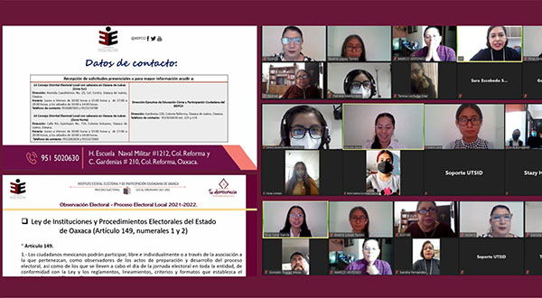 En el marco de las actividades de difusión de la convocatoria de observación electoral del Proceso Electoral Local Ordinario 2021-2022, el Instituto Estatal Electoral y de Participación Ciudadana de Oaxaca, a través de la Dirección Ejecutiva de Educación Cívica y Participación Ciudadana, impartió pláticas informativas virtuales a las personas integrantes de diversas Barras y Colegios de abogadas y abogados de la entidad para dar a conocer las bases, requisitos, documentos, plazos y procedimiento a desahogar para acreditarse como persona observadora electoral.