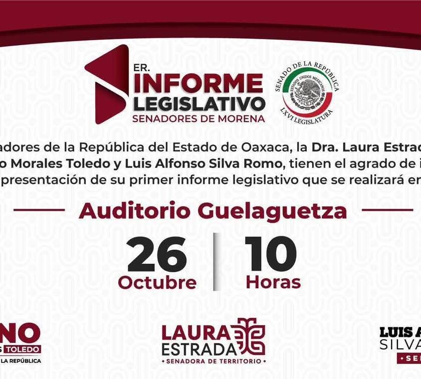 Nos invita para que lo acompañemos a escuchar su Primer Informe de Actividades legislativa este Domingo 26 de Octubre de 2025 en el Auditorio Guelaguetza en la Capital de Nuestro Estado de Oaxaca”.