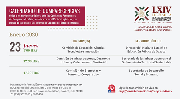 San Raymundo Jalpan, Oax. 22 de Enero 2020. A partir de este jueves 23 de enero y hasta el 4 de febrero próximo, se llevarán a cabo en el Congreso del Estado las comparecencias de 17 integrantes del gabinete legal y ampliado del Ejecutivo Estatal, en el marco de la glosa del Tercer Informe de Gobierno.