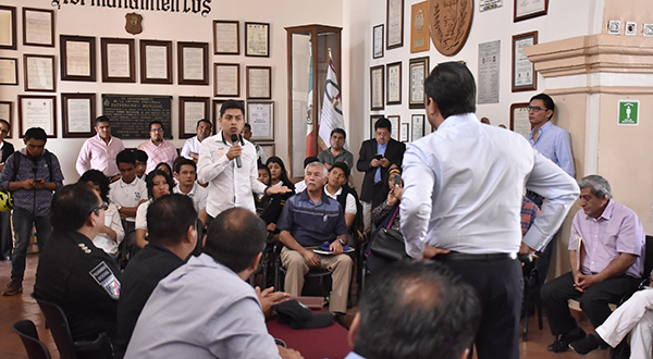 Oaxaca de Juárez, Oaxaca, a 19 de febrero del 2020.- Al recibir en el Palacio Municipal a autoridades escolares, padres de familia y estudiantes del Centro de Bachillerato Tecnológico Industrial y de Servicios (CBTis) 26, el Presidente Municipal de Oaxaca de Juárez, Oswaldo García Jarquín, instruyó al Director de Seguridad Pública, Vialidad y Protección Ciudadana, Aquileo Sánchez Castellanos, fortalecer las labores de vigilancia en inmediaciones de la institución educativa y reforzar los protocolos de atención a llamados de auxilio, para salvaguardar la integridad física y patrimonial de la comunidad escolar.