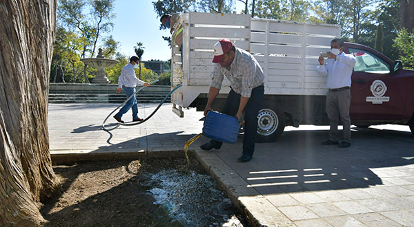 Ambos concejales participaron en el suministro de una solución líquida a base de lombricomposta para nutrir al árbol, que produce en las instalaciones del Vivero Municipal; servidores públicos de la Subdirección de Medio Ambiente realizaron también el riego abundante, a fin de generar mejores condiciones de hidratación que favorezcan la vida y el desarrollo del icónico ejemplar.