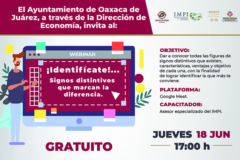 Oaxaca de Juárez, Oaxaca, a 16 de junio de 2020.- Con la finalidad de apoyar a las y los emprendedores y empresarios de la Verde Antequera en el periodo de aislamiento social por COVID-19, el Ayuntamiento de Oaxaca de Juárez, a través de la Dirección de Economía, invita a la ciudadanía a inscribirse en el curso gratuito en línea denominado “¡Identifícate!… Signos distintivos que marcan la diferencia”, que se realizará el próximo jueves 18 de junio.