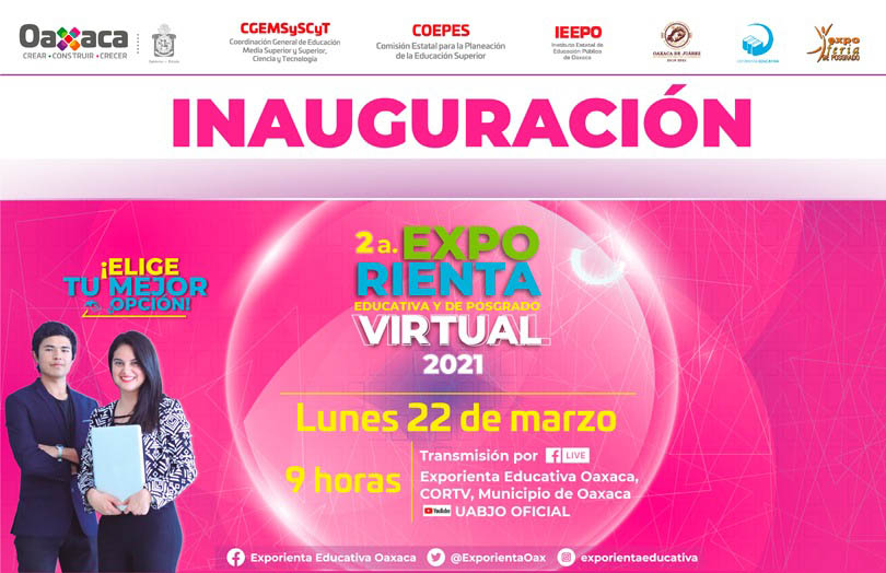 Oaxaca de Juárez, Oaxaca, a 21 de marzo de 2021.– Con la premisa de conjugar esfuerzos para acercar opciones educativas a las juventudes de la ciudad capital, en el contexto de la pandemia de COVID-19, el Ayuntamiento de Oaxaca de Juárez, en colaboración con la Coordinación General de Educación Media Superior y Superior, Ciencia y Tecnología (CGEMSySCyT), invita a la población estudiantil a participar en la Segunda Exporienta Educativa y de Posgrado Virtual 2021, que se realizará del 22 al 27 de marzo.