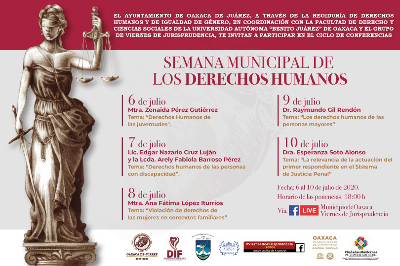 Oaxaca de Juárez, Oaxaca a 2 de julio de 2020.- A fin de incentivar el análisis e intercambio de ideas que profundicen en el respeto de los derechos de las personas para una vida plena y libre, el Ayuntamiento de Oaxaca de Juárez, a través de la Regiduría de Derechos Humanos y de Igualdad de Género, en coordinación con la Facultad de Derecho y Ciencias Sociales de la Universidad Autónoma “Benito Juárez” de Oaxaca (UABJO) y el grupo “Viernes de jurisprudencia”, invita a participar en las actividades de la Semana Municipal de los Derechos Humanos, que se difundirá del 6 al 10 de julio a través de la página de Facebook del Gobierno Municipal.