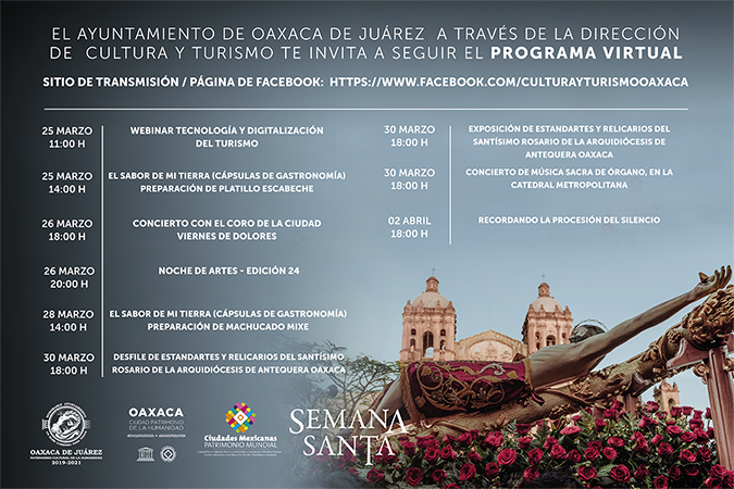 Oaxaca de Juárez, Oaxaca, a 25 de marzo del 2021.- Para difundir las tradiciones y costumbres de la capital características de la temporada de Semana Santa en este contexto de emergencia sanitaria, cuando se privilegia el cuidado de la salud de la población, el Ayuntamiento de Oaxaca de Juárez, a través de la Dirección de Cultura y Turismo, invita a la ciudadanía a seguir la programación de actividades que se difundirán de manera virtual a través de la página: www.facebook.com/CulturayTurismoOaxaca.