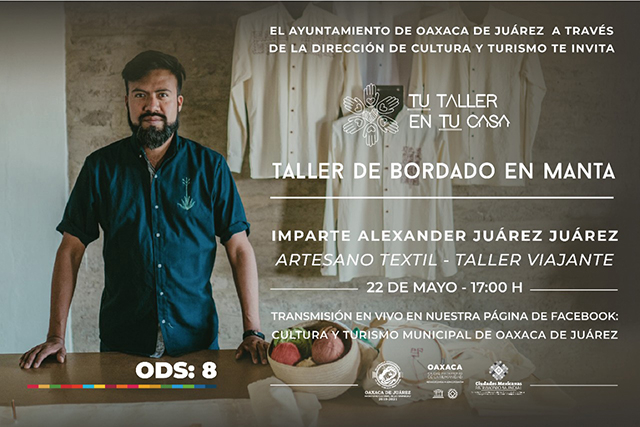 Oaxaca de Juárez, Oaxaca, a 19 de mayo de 2021.- Para compartir los proceso de elaboración de artesanías, el Ayuntamiento de Oaxaca de Juárez, a través de la Dirección de Cultura y Turismo, invita a la ciudadanía a participar en el taller en línea “Bordado en manta”, que se difundirá a través de www.facebook.com/CulturayTurismoOaxaca.