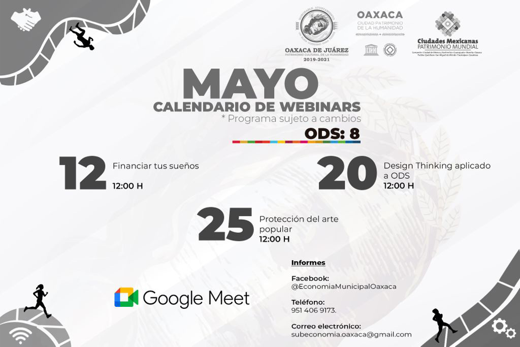 • La Dirección de Economía ofrecerá temas de formación empresarial y fomento emprendedor: “Financiar tus sueños”, el 12 de mayo; “Design Thinking aplicado a ODS”, el 20 de este mes; y “Protección del arte popular”, el día 25.