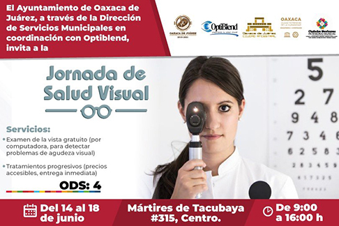 Oaxaca de Juárez, Oaxaca, a 7 de junio de 2021.- Con la premisa de cuidar y proteger la salud integral de la población en el contexto de la pandemia de COVID-19, el Ayuntamiento de Oaxaca de Juárez, a través de la Subdirección de Control Sanitario de la Dirección de Servicios Municipales en coordinación con el Grupo Optiblend, invita a la ciudadanía a la Jornada de Salud Visual que se realizará del 14 al 18 de junio.