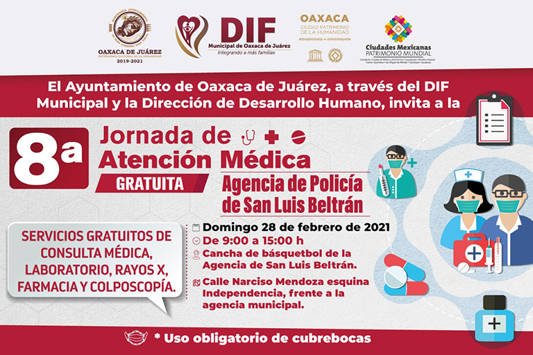 Oaxaca de Juárez, Oaxaca, 25 de febrero de 2021.- En lo que se constituye en un buen ejemplo de conjunción de voluntades entre autoridades municipales, iniciativa privada y sociedad en favor de una causa común que es la atención y salvaguarda de la salud, el Ayuntamiento de Oaxaca de Juárez, a través del DIF Municipal y la Dirección de Desarrollo Humano, extiende una invitación a las y los ciudadanos para que acudan a la Octava Jornada de Atención Médica Gratuita, a realizarse el domingo 28 de febrero en la Agencia de Policía de San Luis Beltrán.