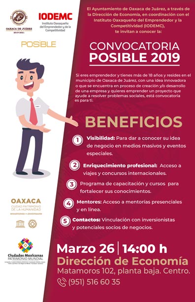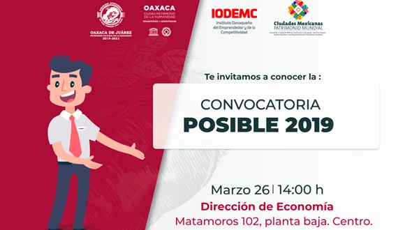 Oaxaca de Juárez, Oaxaca, a 22 de marzo del 2019.- El Municipio de Oaxaca de Juárez, a través de la Dirección de Economía, en coordinación con el Instituto Oaxaqueño del Emprendedor y la Competitividad (IODEMC), invitan a las y los emprendedores mayores de 18 años a conocer la convocatoria del programa POSIBLE 2019.
