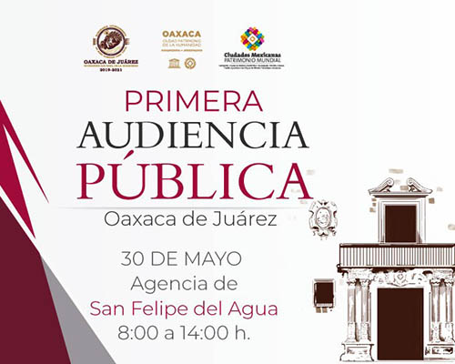 Oaxaca de Juárez, Oaxaca, a 26 de mayo del 2019.- El Presidente Municipal de Oaxaca de Juárez, Oswaldo García Jarquín, invita a las y los vecinos de la Agencia de San Felipe del Agua y colonias circunvecinas a participar en la Primera Audiencia Pública Municipal, que se realizará este jueves 30 de mayo en la explanada de esta demarcación.