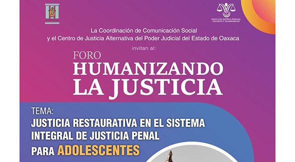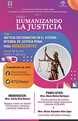 El Poder Judicial del Estado realizará el próximo jueves 6 de julio, en la modalidad virtual, el Foro Humanizando la Justicia, con el tema “La justicia restaurativa en el Sistema Integral de Justicia para Adolescentes”, por lo que invita a la sociedad en general a seguir la transmisión a través de las redes oficiales de la institución.