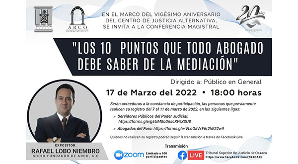 - En el marco de los 20 años del Centro de Justicia Alternativa, el especialista Rafael Lobo Niembro hablará sobre “Los 10 puntos que todo abogado debe saber de la mediación”