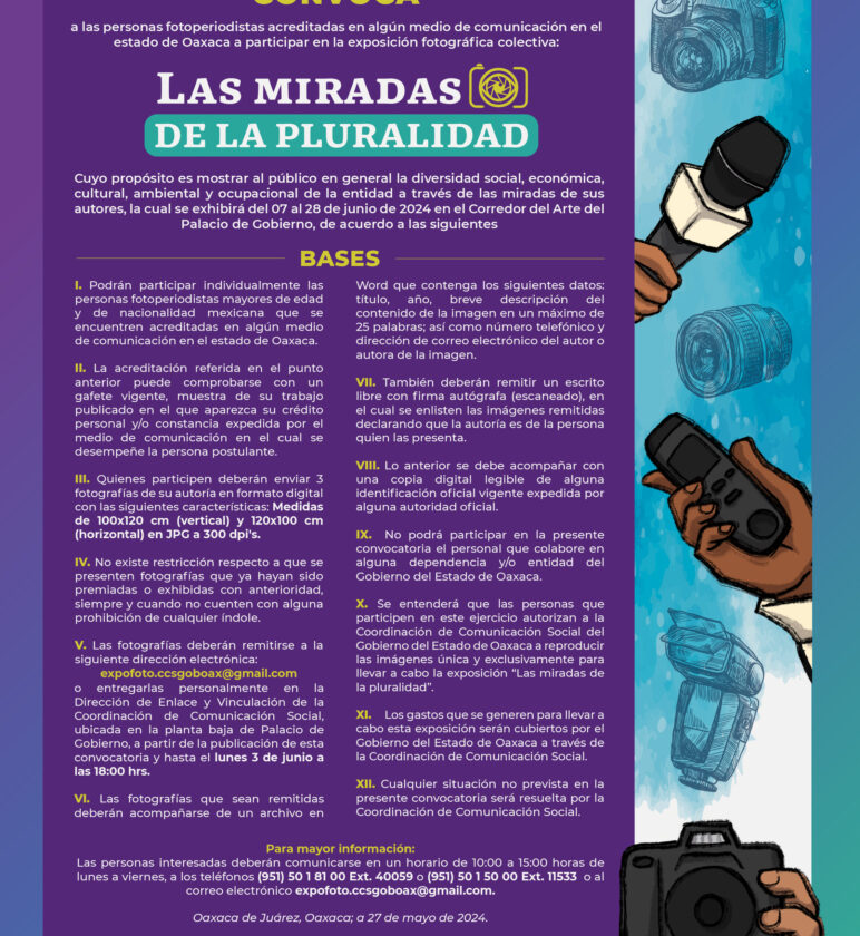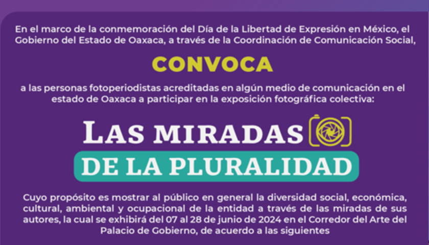 Oaxaca de Juárez, Oax. 28 de mayo de 2024.- En el marco del Día de la Libertad de Expresión que se conmemora el 7 de junio, el Gobierno del Estado de Oaxaca a través de la Coordinación de Comunicación Social, realizará la exposición fotográfica Las miradas de la pluralidad, por lo que abre la convocatoria para que personas fotoperiodistas de la entidad puedan participar.