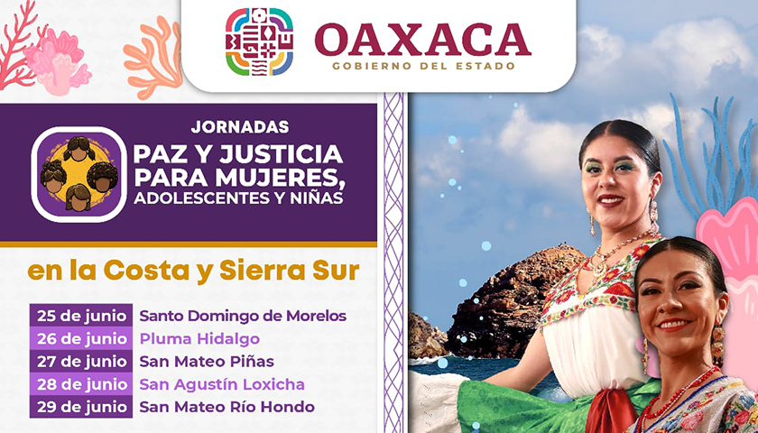 Oaxaca de Juárez, Oax., 20 de junio de 2024.- Del 25 al 29 de junio, el Secretariado Ejecutivo del Sistema Estatal de Seguridad Pública (SESESP) anunció la realización de las Jornadas de Paz y Justicia para Mujeres, Adolescentes y Niñas en las regiones de la Costa y Sierra Sur.