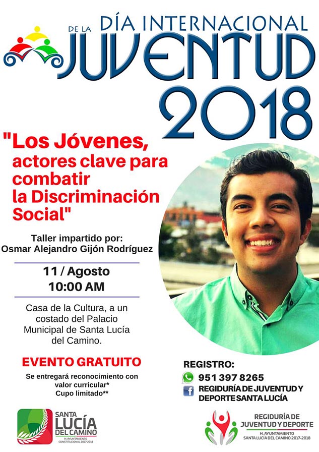 En el marco del Día Internacional de la Juventud y con la finalidad de fomentar en los jóvenes actividades de convivencia sana, el Gobierno Municipal de Santa Lucía del Camino que encabeza Raúl Cruz González, a través de la Regiduría de Juventud y Deporte de esta Municipalidad, han preparado una serie de talleres, eventos deportivos y sociales.