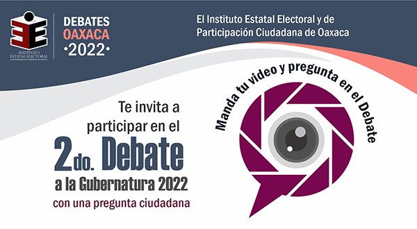 El Instituto Estatal Electoral y de Participación Ciudadana de Oaxaca (IEEPCO), a través de la Comisión Temporal de Comunicación, aprobó la convocatoria “Manda tu video y pregunta en el debate” para la obtención de las preguntas ciudadanas que serán utilizadas en el Segundo Debate entre candidatas y candidatos a la gubernatura del estado, organizado por el Instituto Estatal Electoral y de Participación Ciudadana de Oaxaca para el Proceso Electoral Ordinario 2021-2022.