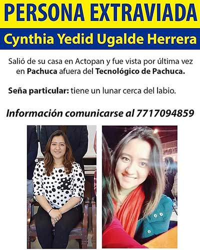 SALINA CRUZ. La estudiante del Instituto Tecnológico de Pachuca, Hidalgo Cynthia Yedith Ugalde Herrera de 21 años quien despareció el pasado 9 de julio fue encontrada en el Puerto de Salina Cruz por elementos de la Policía Municipal y trasladada a la Comisaría debido a que estaba desorientada.