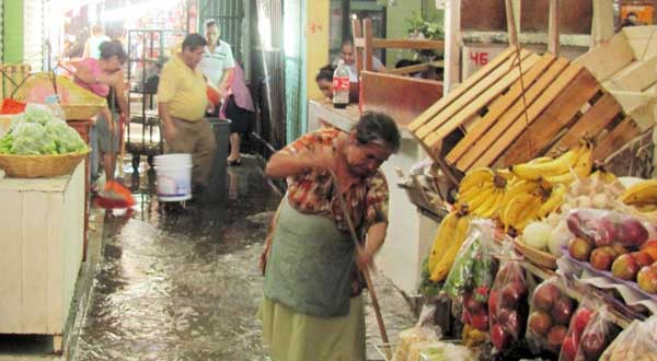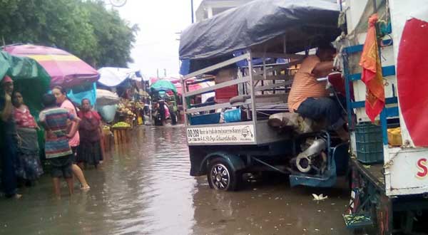 A las 08:00 horas, en que comenzaron a caer las torrenciales lluvias y los comerciantes corrieron a esconderse y olvidaron cubrir las frutas, verduras y hortalizas de la temporada que se mezclaron con las aguas socias.