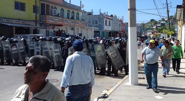 Sobre la avenida Tampico y Teniente Azueta ya los esperaban un grupo de policías estatales adscritos a la SSPO quienes buscaban encapsularlos e impedir que continuaran su marcha hacia el Astillero de Marina.