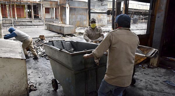 Oaxaca de Juárez, Oaxaca, a 24 de junio de 2020.- Continuando con las acciones de atención integral, así como de prevención del COVID-19 en el Mercado de Abasto, el Ayuntamiento de Oaxaca de Juárez, en coordinación con instancias estatales, continúa realizando trabajos limpieza y saneamiento, además de labores de remoción de escombros en la zona afectada por el incendio suscitado el pasado 27 de mayo.
