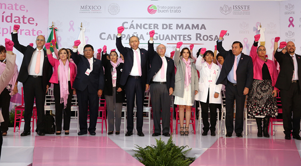 “En el ISSSTE estamos marcando la pauta y hemos logrado disminuir gradualmente la tasa de mortalidad del cáncer de mama. Cuando en el país es cercana al 18.1 por cada 100 mil mujeres, en el Instituto es de 15.8”, dijo el Director General del Instituto, José Reyes Baeza Terrazas, al encabezar el encuentro “Guantes Rosas”, junto con el Secretario de Salud, José Narro Robles.