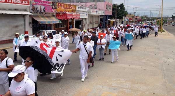 SALINA CRUZ.-Médicos, enfermeras, administrativos y de suministros del Instituto Mexicano del Seguro Social, Hospital con Especialidades, el Instituto de seguridad y Servicios Sociales de los Trabajadores del Estado y el Centro de Salud, realizaron una marcha para rechazar la Reforma que se pretende implementar en materia de Salud.
