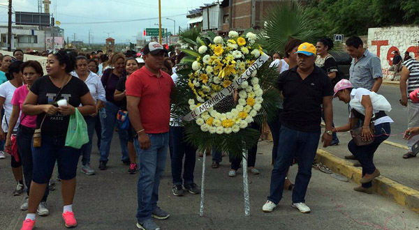 Vestidos la mayoría con playera y blusa blanca, además portando una Corona con una leyenda “En memoria a los caídos”, en señal de duelo por la muerte de algunos de sus compañeros durante el fallido desalojo en la autopista de Nochistlán.