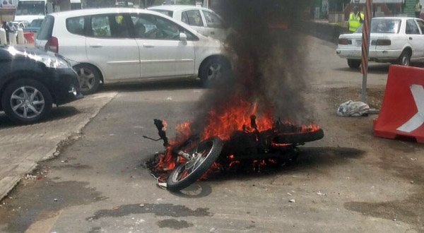Integrantes del grupo de mototaxistas del grupo Frente Popular 14 de Junio, cuyo líder, Francisco Martñinez, alias “Don Panchito”, se encuentra preso en el reclusorio de Miahuatlán de Porfirio Díaz ocasionaron un enésimo hecho sangriento frente a la mirada de policías municipales de Santa Cruz Xoxocotlán al destrozar e incendiar una motocicleta y causar daños a un negocio.