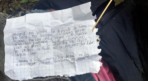 La mujer quien permanece como desconocida fue encontraba boca abajo y vestía pantalón de mezclilla, chaleco y blusa color azul, misma que aun lado de su cuerpo tenía un envase de veneno y alimentos, así como mensaje póstumo dirigido a sus familiares.