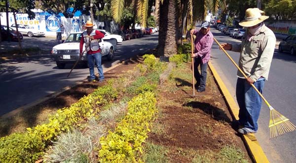 Durante los trabajos, el personal llevo a cabo el retiro de material contaminado en jardineras y camellones; mantenimiento de las plantas, pasto y árboles; riego, decorados con piedra blanca triturada, entre otras.