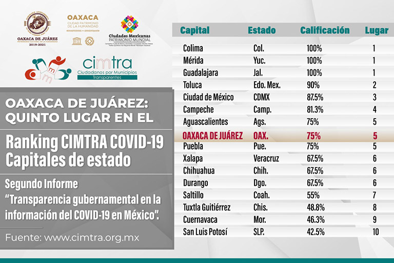 • El Ayuntamiento se ubicó en el quinto sitio del Ranking CIMTRA COVID-19 capitales de estado; Oaxaca de Juárez esta en el grupo de capitales del país que presentan un avance con base en resultados o incrementando la información a disposición de la ciudadanía.