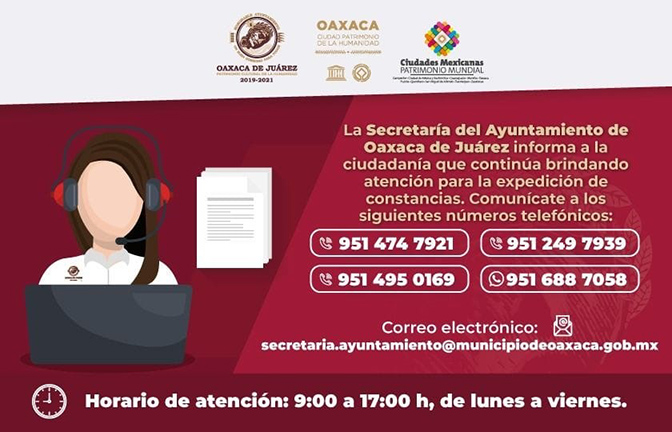 - La Secretaría del Ayuntamiento brinda atención en los teléfonos 951 474 7921, 951 495 0169, 951 249 7939 y 951 615 3922 (WhatsApp), de lunes a viernes, de 9:00 a 17:00 horas.