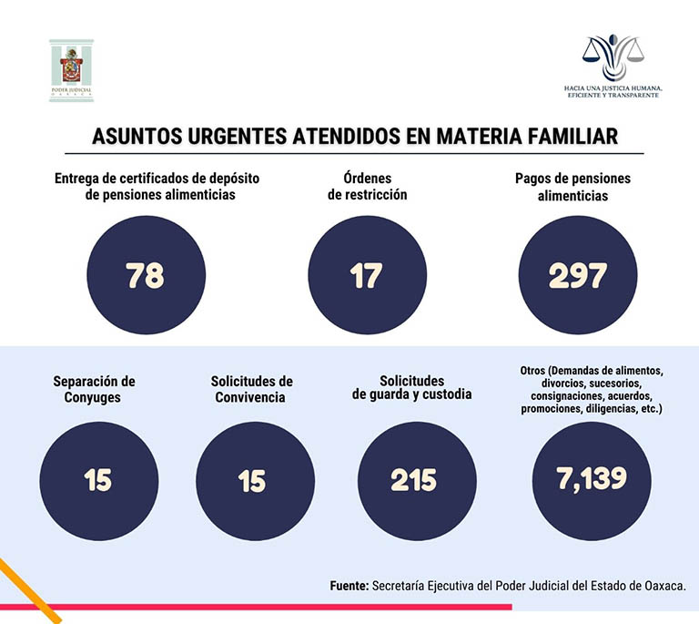 Cabe resaltar que del 5 de enero al 5 de febrero del 2021, el Poder Judicial del Estado dio trámite a siete mil 776 asuntos en materia familiar a través de juzgados familiares, civiles y mixtos de primera instancia; de los cuales destacan pagos de pensiones alimenticias, separación de cónyuges, solicitudes de convivencia, guarda y custodia, así como órdenes de restricción.