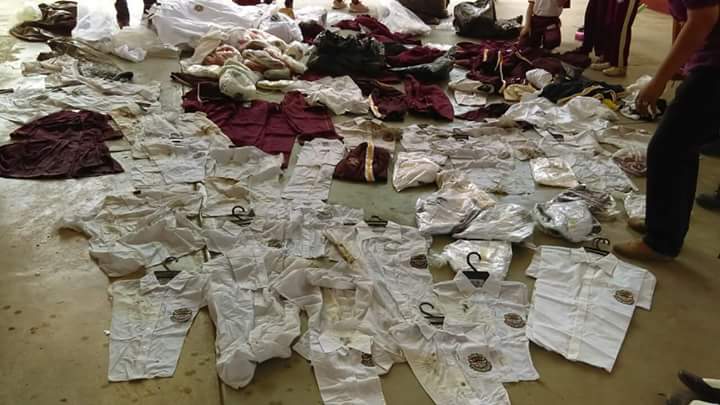 Tan sólo de uniformes encontrados fueron: 65 camisas para niño, 163 blusas para niñas, 16 playeras deportivas, 17 pants deportivos, 40 pantalones y 21 faldas, que se encontraban mojados, manchados o afectados por la humedad que se registró en la bodega donde estuvieron resguardados.