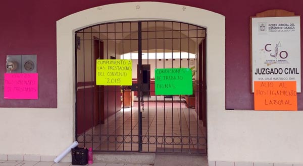 Por lo menos unos 50 empleados de los Juzgados de Garantía, Civil, Familiar se mantienen afuera de cada una de estas dependencias como medida de presión para exigir a la parte patronal que recae en el Tribunal de Justicia en Oaxaca atienda cada una de sus demandas que hasta el momento permanecen estancadas.