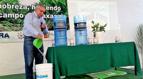 El investigador Sergio Jesús Rico, presentó un polímero en forma de polvo que atrapa el agua y puede ser almacenada en costales u otro recipiente que permita conservarla para ser usada en la temporada de sequía, logrando una producción fuera de la temporada de lluvias.