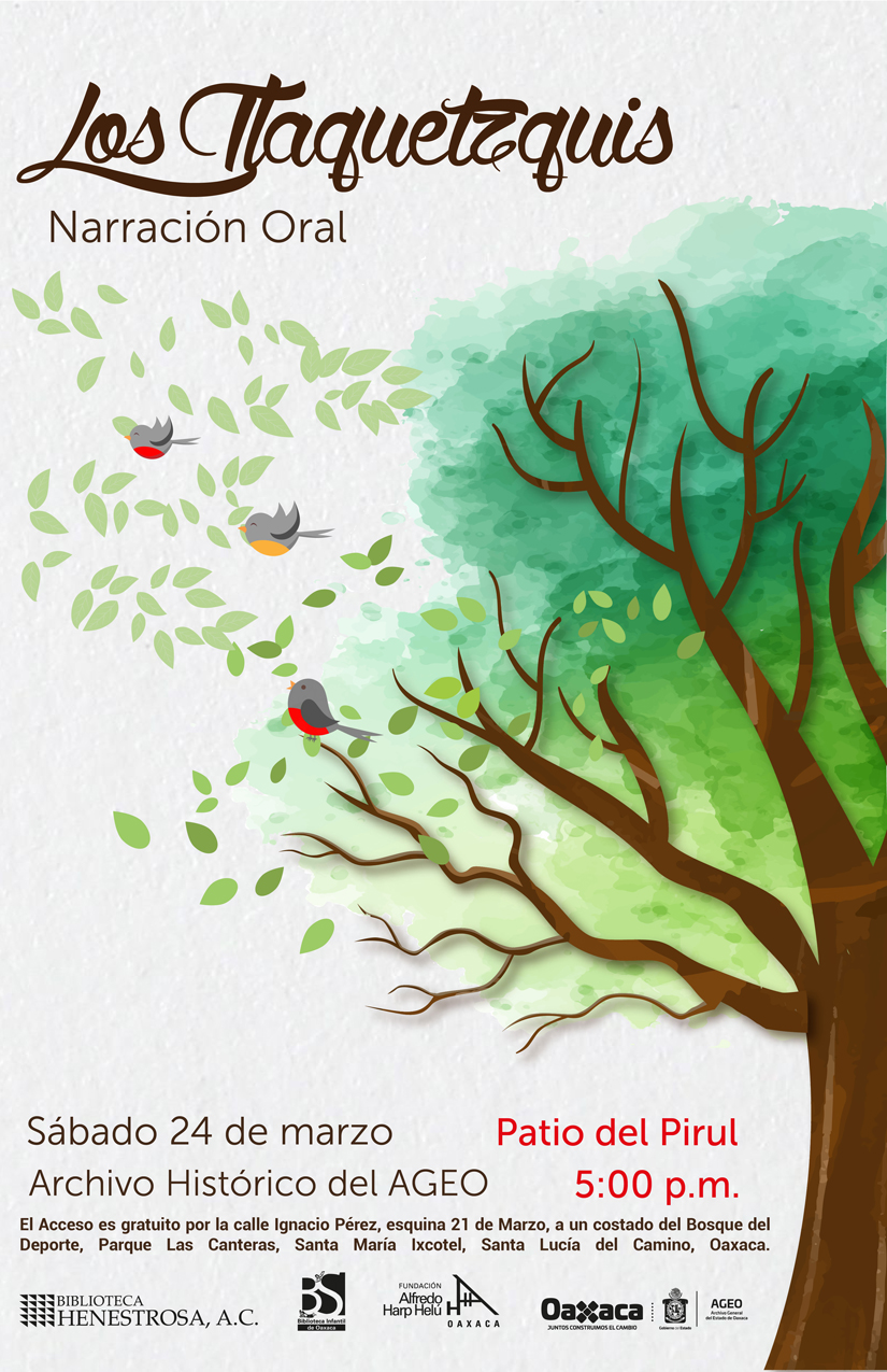 La tarde de este sábado 24 de marzo en las instalaciones del Archivo General de Estado de Oaxaca (AGEO), narradores y cuenta cuentos compartirán diversas historias llenas de fantasía y tradición como parte del programa de narración oral “Los Tlaquetzquis”.