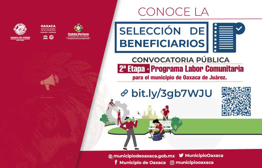 Oaxaca de Juárez, Oaxaca, a 20 de agosto de 2020.- Después de un meticuloso procedimiento de análisis y evaluación de 684 solicitudes de personas interesadas en participar en la segunda etapa del Programa “Labor Comunitaria”, el Ayuntamiento de Oaxaca de Juárez, a través de la Dirección de Economía, da conocer que el listado de 150 folios seleccionados ya se encuentra disponible para su consulta en el sitio web www.municipiodeoaxaca.gob.mx.