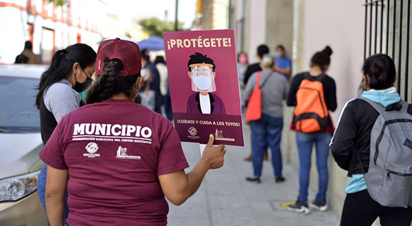 Oaxaca de Juárez, Oaxaca, a 15 de enero de 2021.- Con la premisa de salvaguardar la salud de la población en lugares de alta concurrencia, el Ayuntamiento de Oaxaca de Juárez, a través de la Coordinación Ejecutiva del Centro Histórico, dio inicio a una jornada de concientización a las afueras de instituciones bancarias de la ciudad, para subrayar a las y los usuarios la importancia de cumplir con los protocolos sanitarios contra la pandemia de COVID-19.