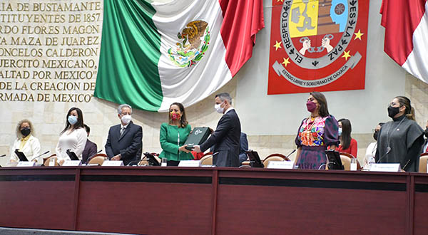 San Raymundo Jalpan, Oax. 15 de noviembre de 2021.- Durante la apertura del Primer Periodo Ordinario de Sesiones, correspondiente al Primer Año de Ejercicio Constitucional de la 65 Legislatura Local, en Sesión Solemne y en cumplimiento al artículo 43 de la Constitución Política local, el Gobernador, Alejandro Murat Hinojosa, entregó el compendio del Quinto Informe de actividades de su administración.