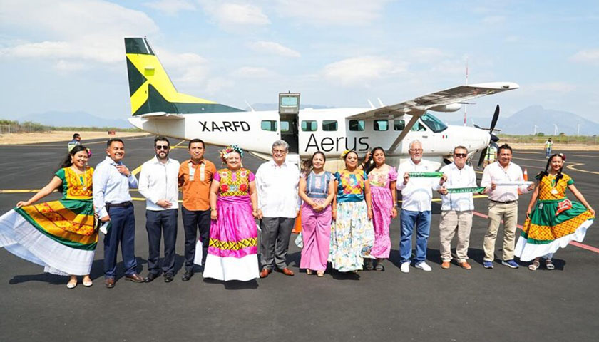 Ciudad Ixtepec, Oax. 20 de abril de 2026.- La Secretaría de Turismo (Sectur Oaxaca), representantes de la aerolínea Fly Aerus y autoridades municipales recibieron este lunes el primer vuelo de la nueva ruta que enlaza a este municipio del Istmo de Tehuantepec con el Aeropuerto Internacional Felipe Ángeles (AIFA), ubicado en Ciudad de México.