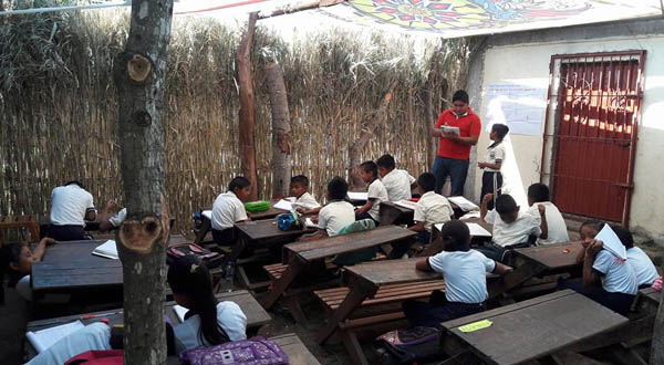 Detallaron que con la ayuda de los padres colocaron postes de madera y para dividir las aulas de colocaron palmas, esto para determinar el área donde le corresponde a cada niño.