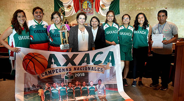 San Raymundo Jalpan.- Luego de haber ganado una justa nacional de básquetbol, la selección femenil sub 17 de Oaxaca visitó las instalaciones del Congreso local, donde previó a la Sesión Ordinaria, la presidenta de la Junta de Coordinación Política María de las Nieves García Fernández les otorgó un reconocimiento a nombre del Poder Legislativo.
