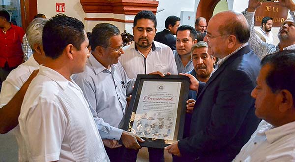 Este miércoles, autoridades auxiliares de las 13 Agencias Municipales y de Policía de la capital, entregaron un reconocimiento al Presidente Municipal de Oaxaca de Juárez, Javier Villacaña Jiménez, por las acciones y obras realizadas en sus respectivas demarcaciones.