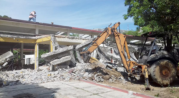 Con maquinaria pesada comenzó la demolición de la fachada del inmueble, en tanto que otros obreros con marro golpean con fuerza la losa para debilitarlo como parte de los trabajos que se realizan al exterior e interior.