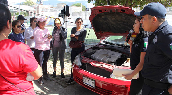 También se realizó un breve taller de mecánica básica para detectar fallas en vehículos, para ello personal del Área de Mantenimiento Vehicular mostró a las y los asistentes los puntos básicos del sistema eléctrico y mecánico de un automóvil, así como las medidas de seguridad que se deben de tomar al momento de cambiar una llanta.
